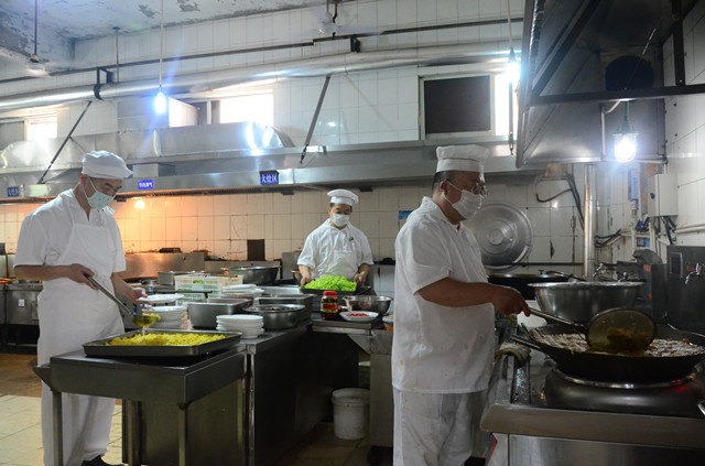 圖為職工食堂工作人員在為生產(chǎn)車間員工準(zhǔn)備工作餐和分發(fā)粽子的情形。
