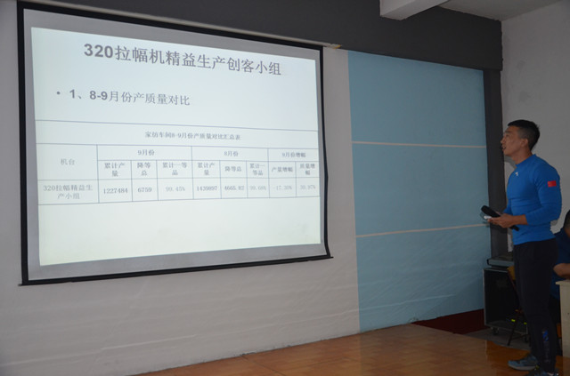 9月份,340退漿精益生產(chǎn)小組累計產(chǎn)量1550842 米,累計一等品率99.94%,個人戰(zhàn)斗力排名前三名依次為崔飛飛、韓小明、李衛(wèi)波。該小組10月份攻關(guān)目標(biāo):一等品率不低于99.95%,改變思想,努力生產(chǎn)好每一米布,完成攻關(guān)目標(biāo)和車間下達(dá)的任務(wù)。320絲光精益生產(chǎn)小組累計產(chǎn)量908218米,累計一等品率99.94%,個人戰(zhàn)斗力排名前三名依次為王寧、陳寶棟、魏立軍。該小組10月份攻關(guān)目標(biāo):一等品率不低于99.95%,繼續(xù)做好本小組培訓(xùn),積極完成小組和車間下達(dá)的任務(wù)。320拉幅精益生產(chǎn)小組累計產(chǎn)量1227484米,累計一等品99.45%,個人戰(zhàn)斗力排名前三名依次為王沙沙、李志強(qiáng)、牌紅軍。該小組10月份攻關(guān)目標(biāo)為無質(zhì)量事故,機(jī)組產(chǎn)量130萬米,機(jī)臺一等品率99.75%。冷染精益生產(chǎn)小組累計產(chǎn)量2038410米,累計一等品99.25%,個人戰(zhàn)斗力排名前三名依次為趙寶忠、王超、張乃順。該小組10月份攻關(guān)目標(biāo)為在九月份的基礎(chǔ)上再降50%。卷烘精益生產(chǎn)小組累計產(chǎn)量1646018米,累計一等品99.84%,個人戰(zhàn)斗力排名前三名依次為閆倍倍、周志強(qiáng)、張延峰。該小組10月份攻關(guān)目標(biāo)質(zhì)量99.9%,無質(zhì)量事故,疵布不符樣疵點(diǎn)相比9月份下降20%,做好預(yù)控培訓(xùn),保證產(chǎn)品質(zhì)量,提升操作技能的方法。