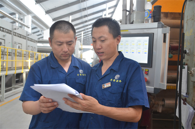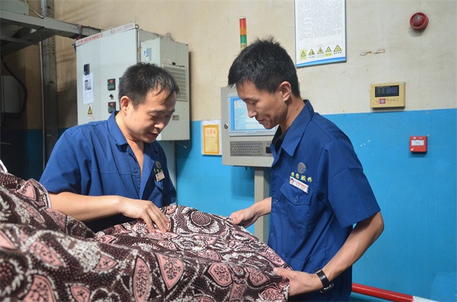 花布車間現(xiàn)場主管紀(jì)方超(右)與焙烘機(jī)機(jī)長孫海雷,在查看金粉印花生產(chǎn)質(zhì)量。