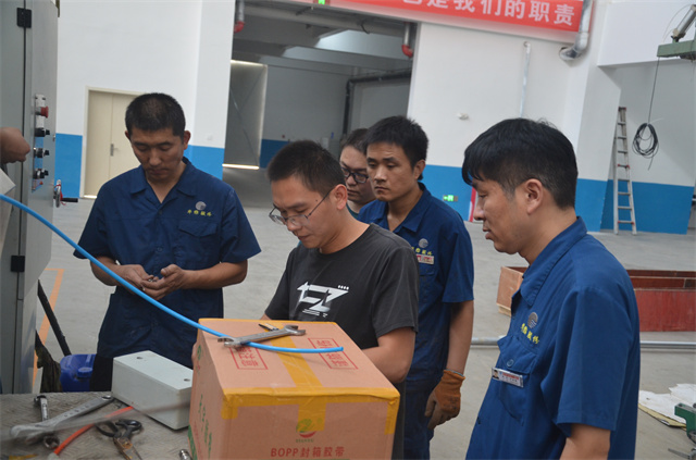 家紡車間丙班水洗機(jī)新員工劉叢叢(左),正在接受師傅的現(xiàn)場培訓(xùn)與指導(dǎo)。