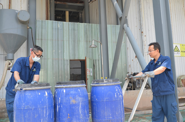 員工正在將機(jī)臺(tái)回收的花毛,運(yùn)送至水處理
