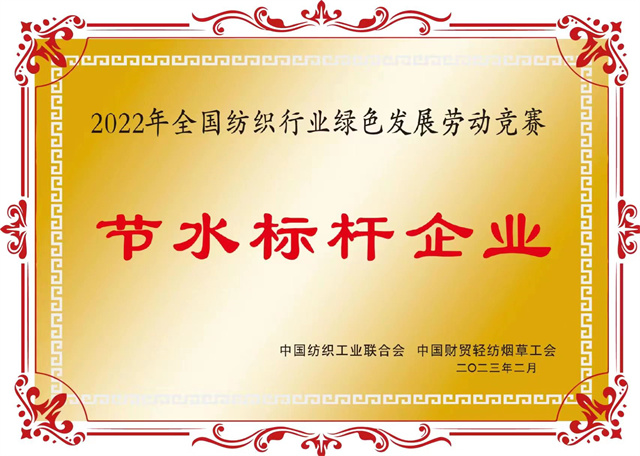 為大力弘揚(yáng)勞模精神、勞動(dòng)精神、工匠精神,組織引導(dǎo)廣大職工為推動(dòng)紡織行業(yè)綠色低碳循環(huán)發(fā)展貢獻(xiàn)智慧和力量。2022年,中國(guó)紡織工業(yè)聯(lián)合會(huì)與中國(guó)財(cái)貿(mào)輕紡煙草工會(huì)組織開展了涉及節(jié)水增效、節(jié)能降碳兩個(gè)領(lǐng)域的全國(guó)紡織行業(yè)綠色發(fā)展勞動(dòng)競(jìng)賽。在近日公布的競(jìng)賽結(jié)果的通報(bào)中,公司獲評(píng)“節(jié)水標(biāo)桿企業(yè)”榮譽(yù)稱號(hào)、公司系統(tǒng)工程部能源副總工于濤榮獲“節(jié)水增效先進(jìn)個(gè)人”榮譽(yù)稱號(hào)。