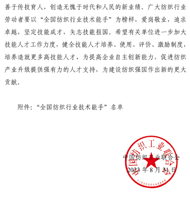 導(dǎo)讀:近日,中國(guó)紡織工業(yè)聯(lián)合會(huì)發(fā)布了授予在2023年全國(guó)紡織行業(yè)勞動(dòng)技能競(jìng)賽中取得前18名的紡織企業(yè)員工為“全國(guó)紡織行業(yè)技術(shù)能手”榮譽(yù)稱(chēng)號(hào)的決定,
