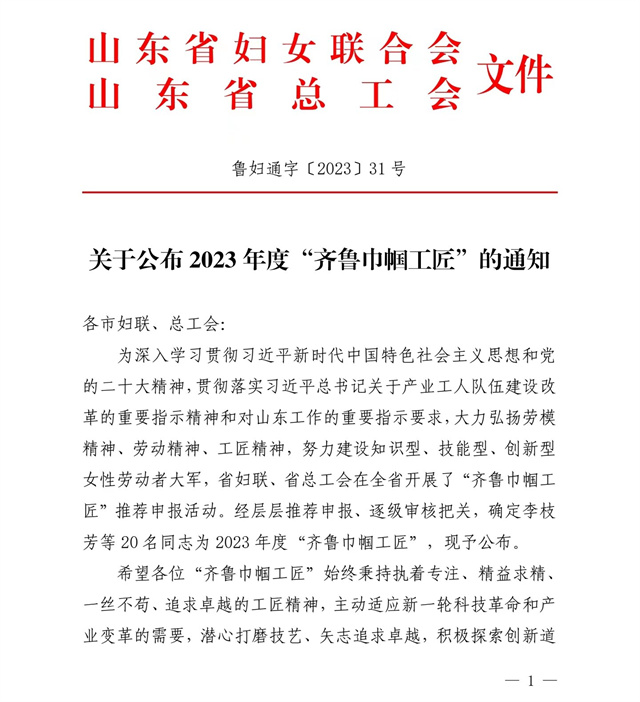 導(dǎo)讀:近日,山東省婦女聯(lián)合會(huì)、山東省總工會(huì)發(fā)布了“關(guān)于公布2023年度‘齊魯巾幗工匠’的通知”,公司染化料配制工郭冬梅名列其中。