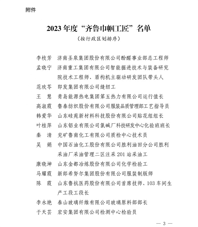 為大力弘揚(yáng)勞模精神、勞動(dòng)精神、工匠精神,努力建設(shè)知識(shí)型、技能型、創(chuàng)新型女性勞動(dòng)者大軍。近日,山東省婦女聯(lián)合會(huì)、山東省總工會(huì)發(fā)布了“關(guān)于公布2023年度‘齊魯巾幗工匠’的通知”,公司染化料配制工郭冬梅名列其中。
