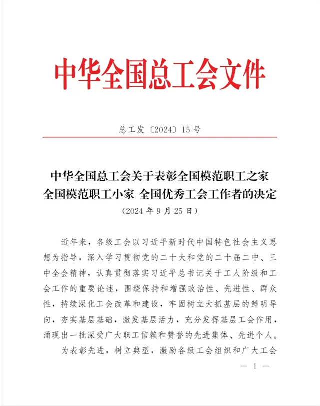“全國模范職工之家”是中華全國總工會設(shè)立的授予全國工會系統(tǒng)先進集體的最高榮譽,是對基層工會工作的最高褒獎和肯定。公司工會在公司黨委領(lǐng)導(dǎo)下,以習(xí)近平新時代中國特色社會主義思想為指導(dǎo),深入學(xué)習(xí)貫徹黨的二十大和黨的二十屆二中、三中全會精神,認(rèn)真貫徹落實習(xí)近平總書記關(guān)于工人階級和工會工作的重要論述,牢固把握正確政治方向,充分發(fā)揮橋梁紐帶作用,切實維護職工合法權(quán)益,努力構(gòu)建和諧勞動關(guān)系,不斷增強工會組織的引領(lǐng)力、組織力、服務(wù)力,為公司高質(zhì)量發(fā)展貢獻工會智慧和力量。