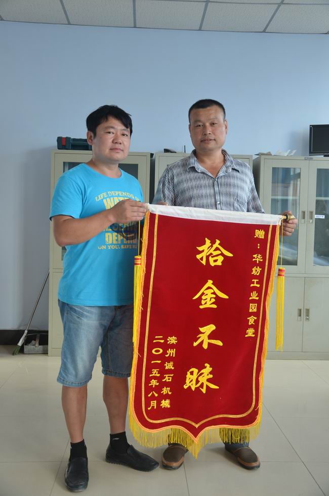 導讀:前不久,在公司科技產(chǎn)業(yè)園區(qū)食堂工作的陳春青收到了濱州誠石機械工作人員送來的錦旗,在對其拾金不昧表示感謝的同時,也表達了對陳春青的敬意。 就在不久前,濱州誠石機械的工